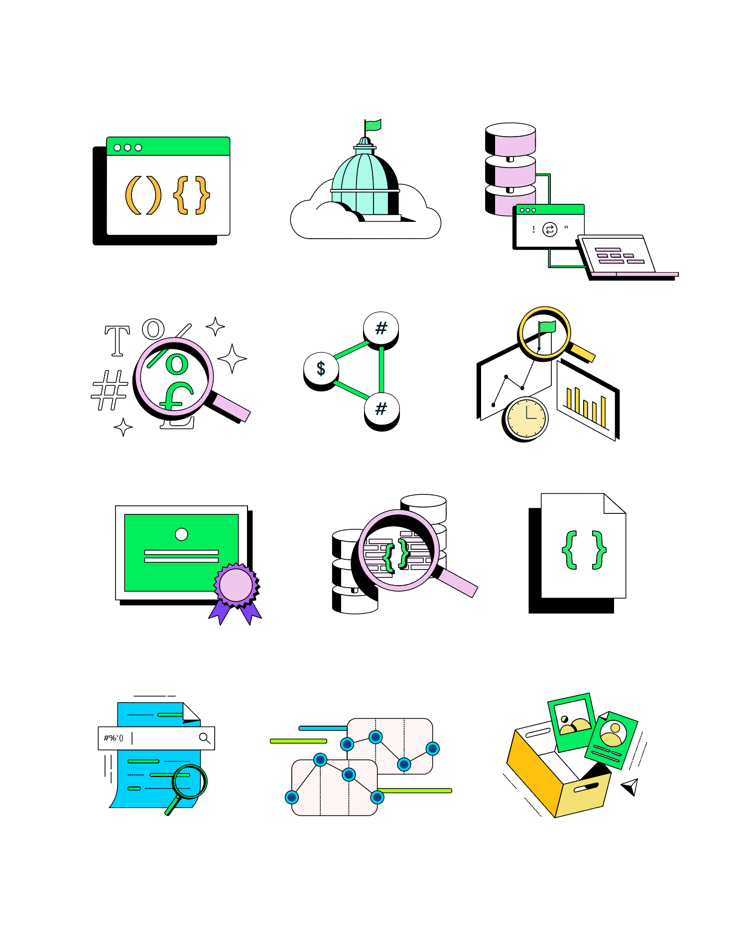 A selection of illustrations I created for MongoDB, featuring technical and product visuals used across webpages, conference presentations, and educational materials.
